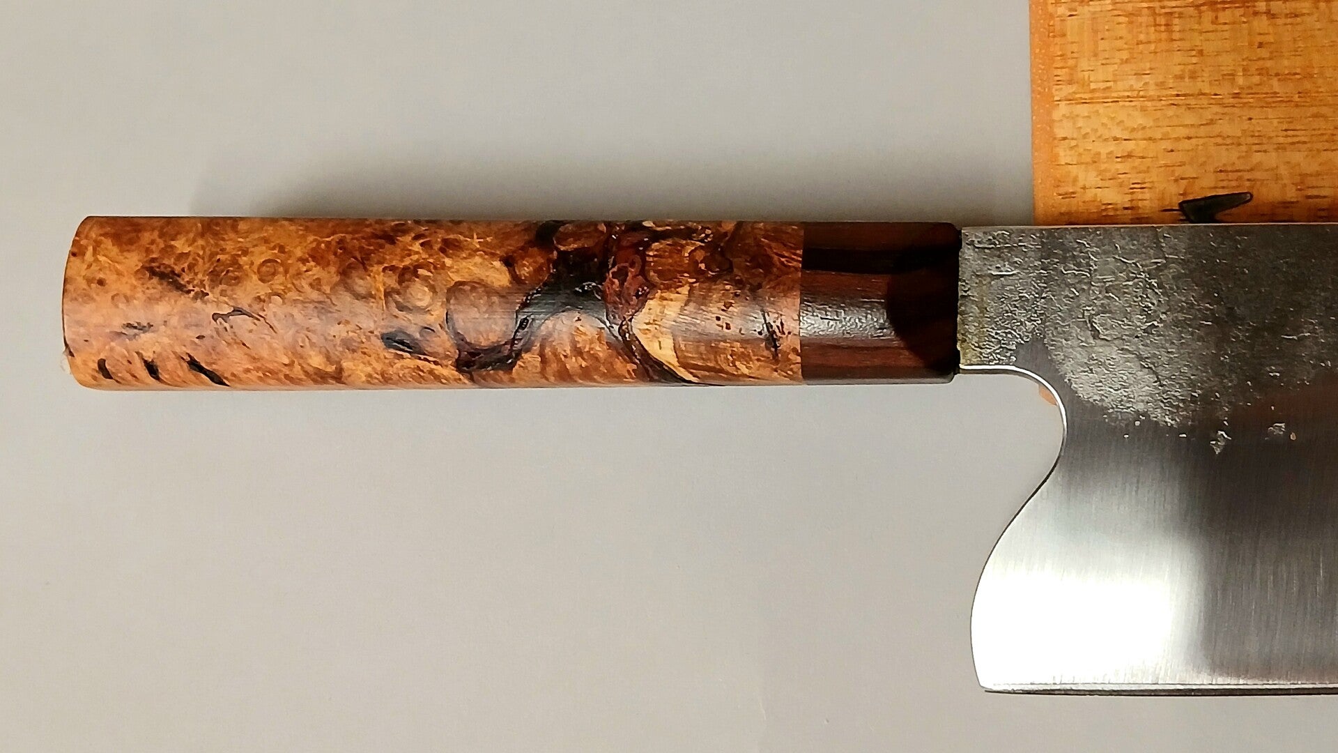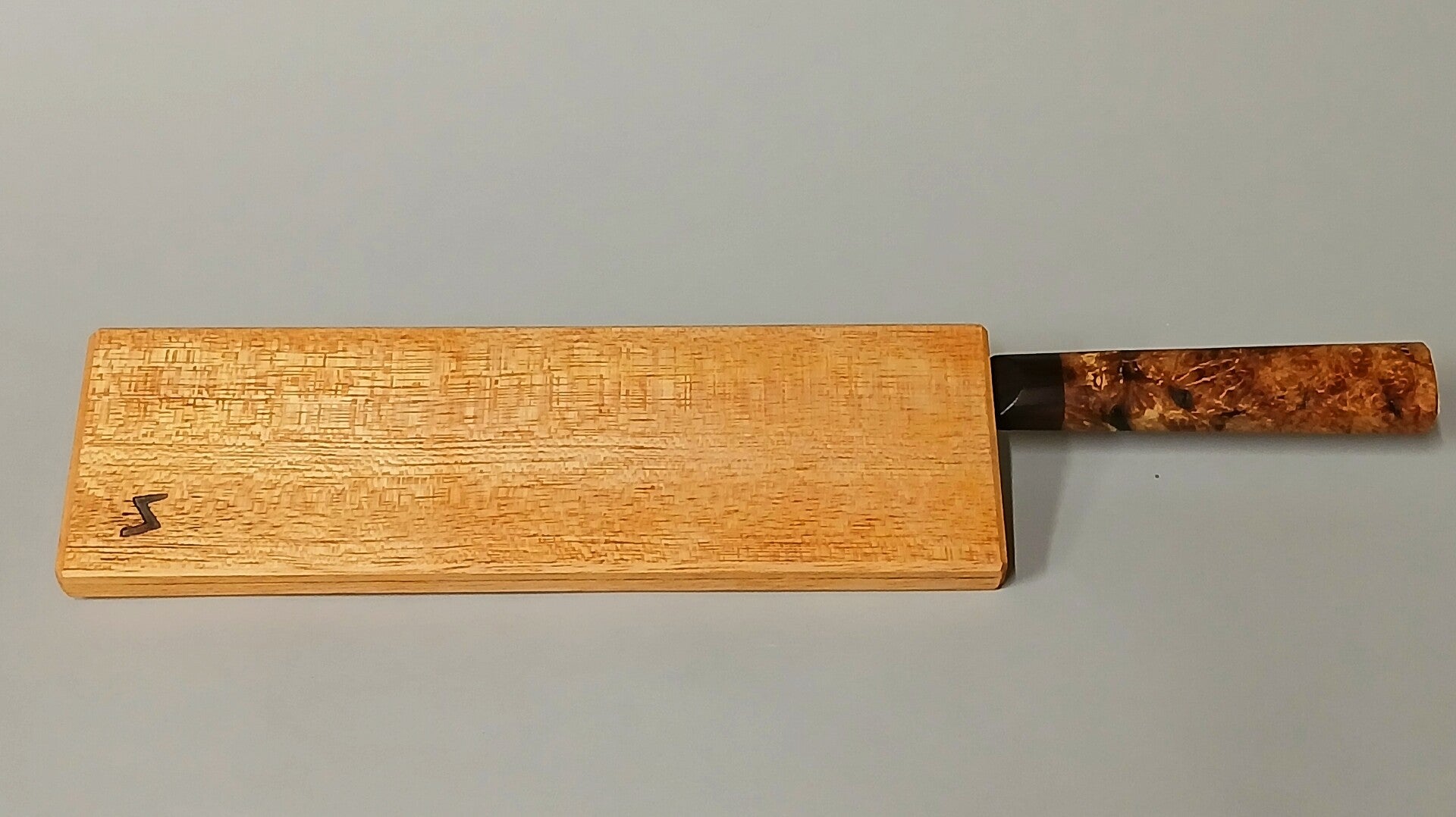 Groot chefmes van hoogwaardig koolstofstaal, voorzien van een elegant handvat gemaakt van ebbenhout en esdoorn. Wordt geleverd met een bijpassende houten schede.