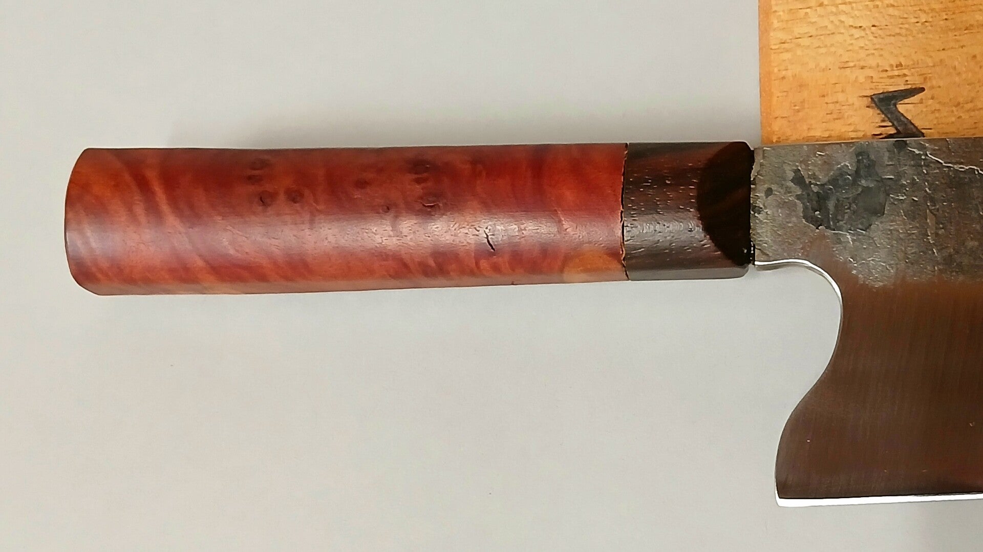 Groot chefmes van hoogwaardig koolstofstaal, voorzien van een elegant handvat gemaakt van ebbenhout en eucalyptus. Het mes wordt geleverd met een stijlvolle houten schede.
