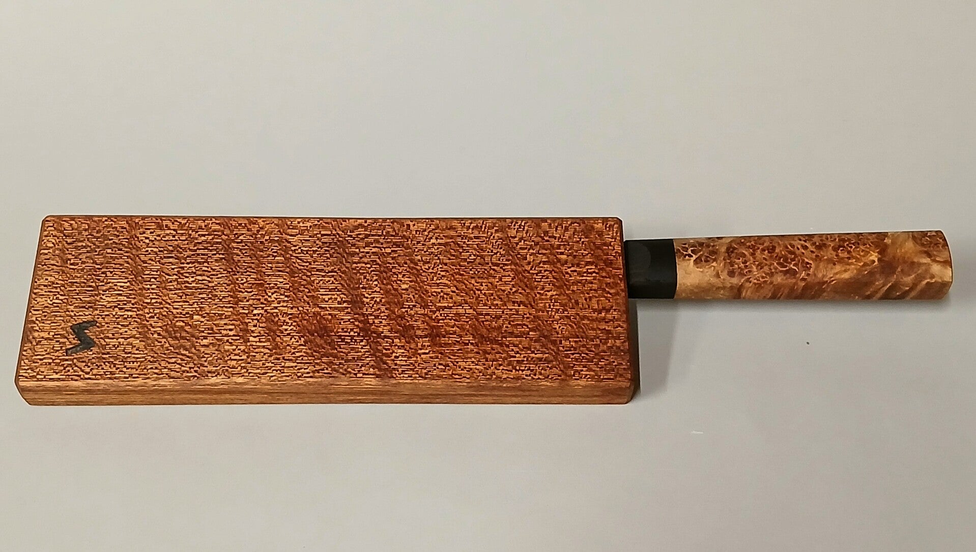 Demi-chefmes van hoogwaardig koolstofstaal, voorzien van een elegant handvat van ebbenhout en esdoorn. Wordt geleverd met een bijpassende houten schede.