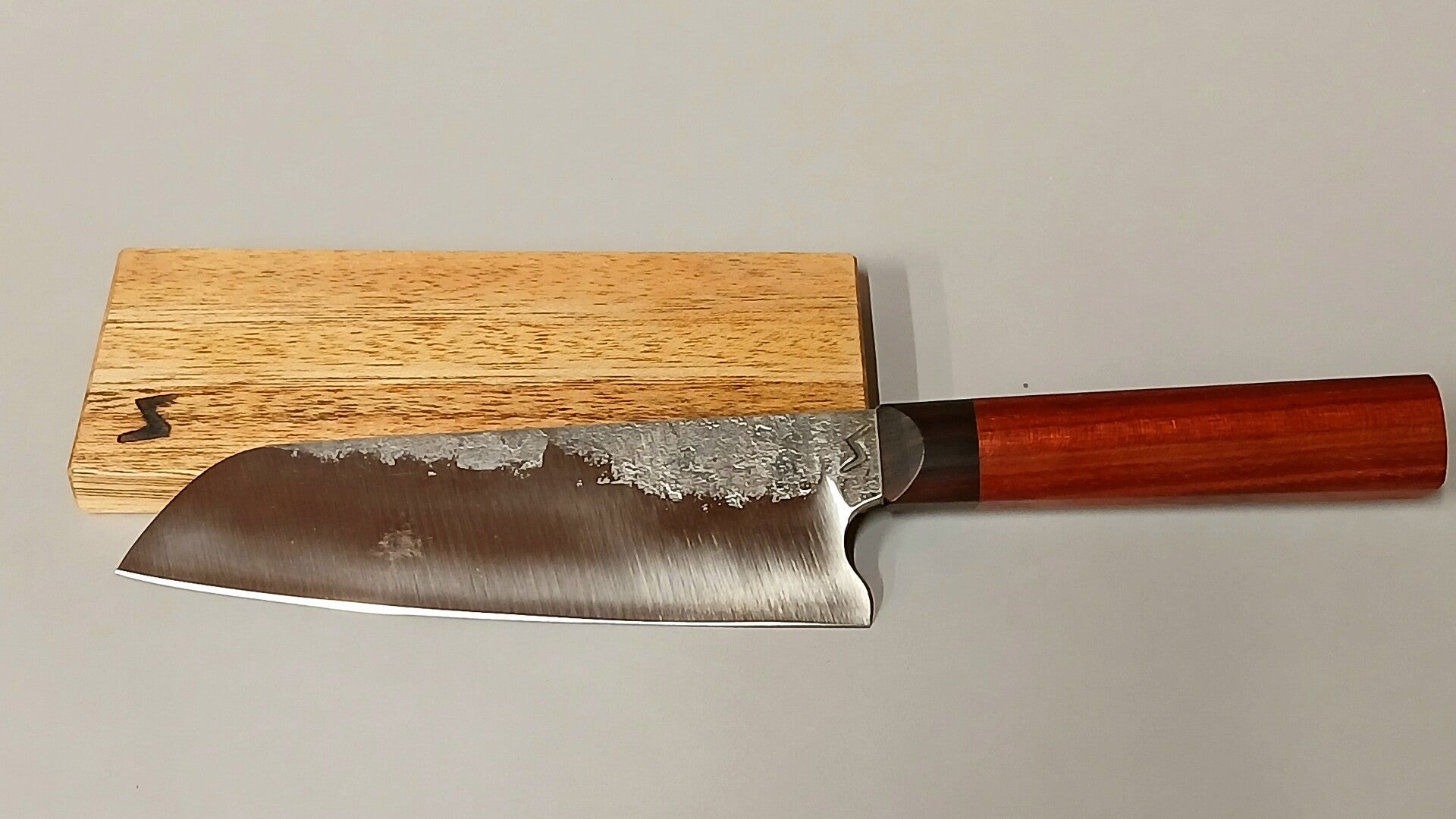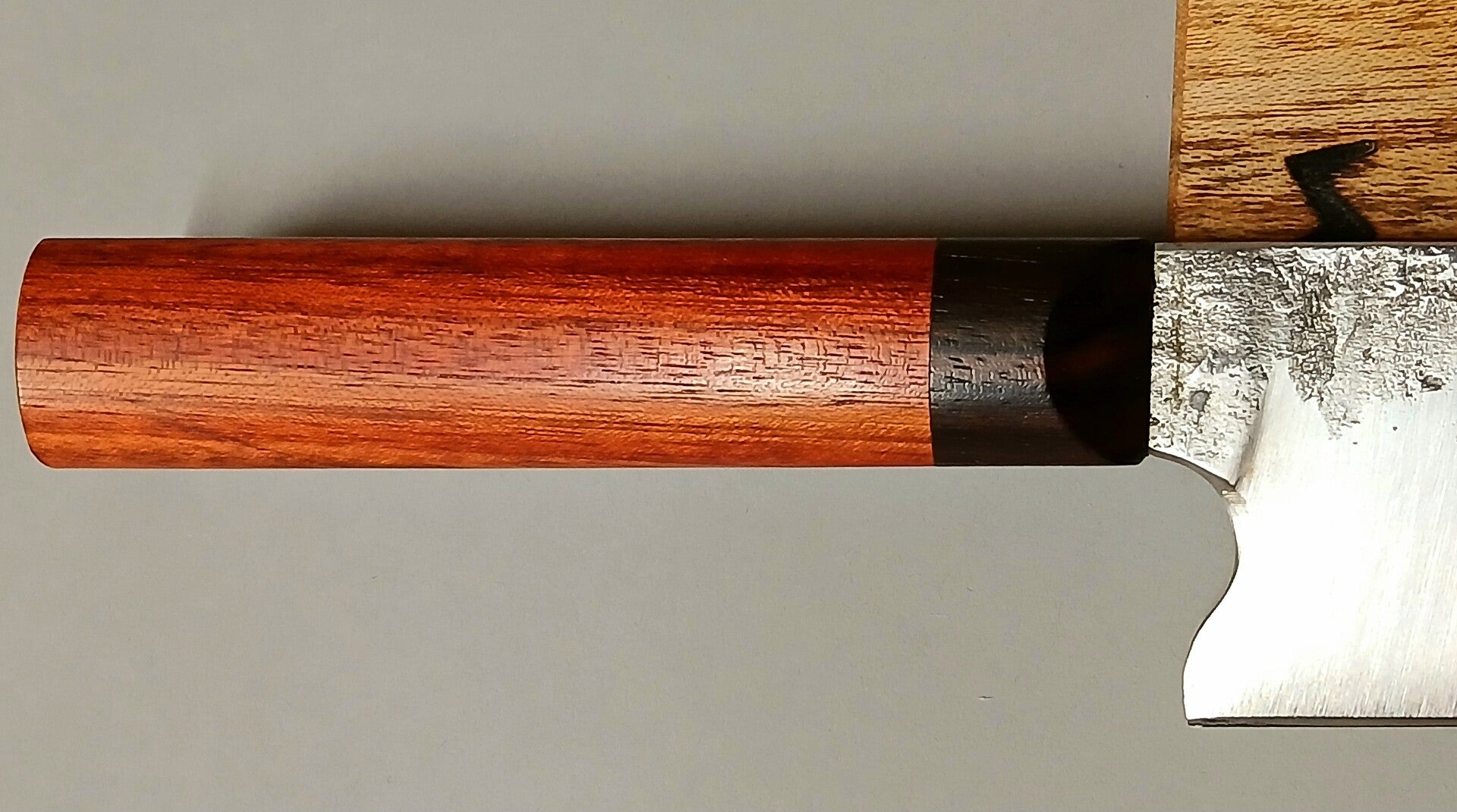 Kein chefmes van hoogwaardig koolstofstaal, voorzien van een elegant handvat van ebbenhout en rozenhout. Wordt geleverd met een bijpassende houten schede.