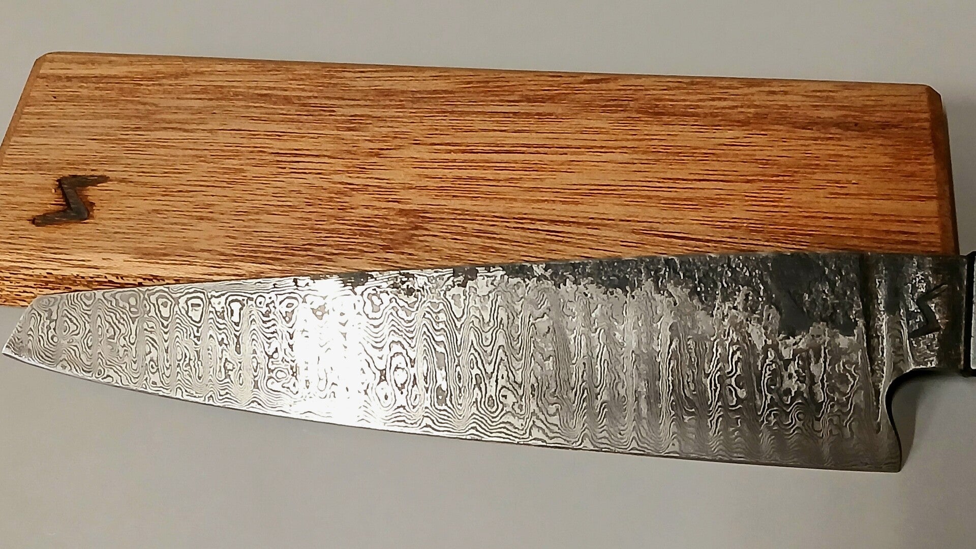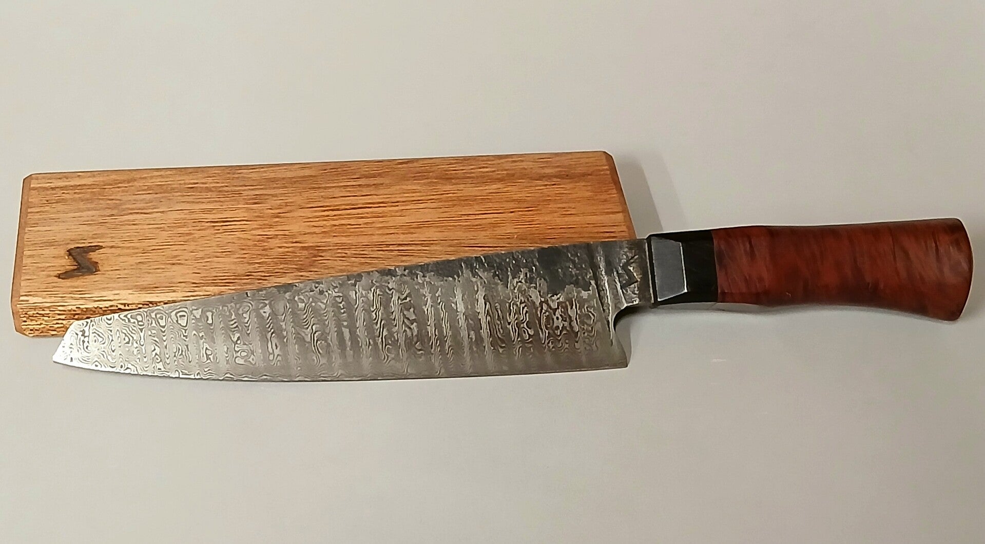 Een klein chefmes van hoogwaardig damaststaal, voorzien van een elegant handvat gemaakt van ebbenhout en eucalyptus. Het mes wordt geleverd met een stijlvolle houten schede.