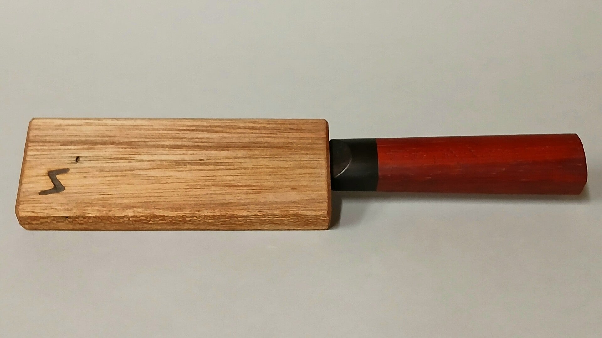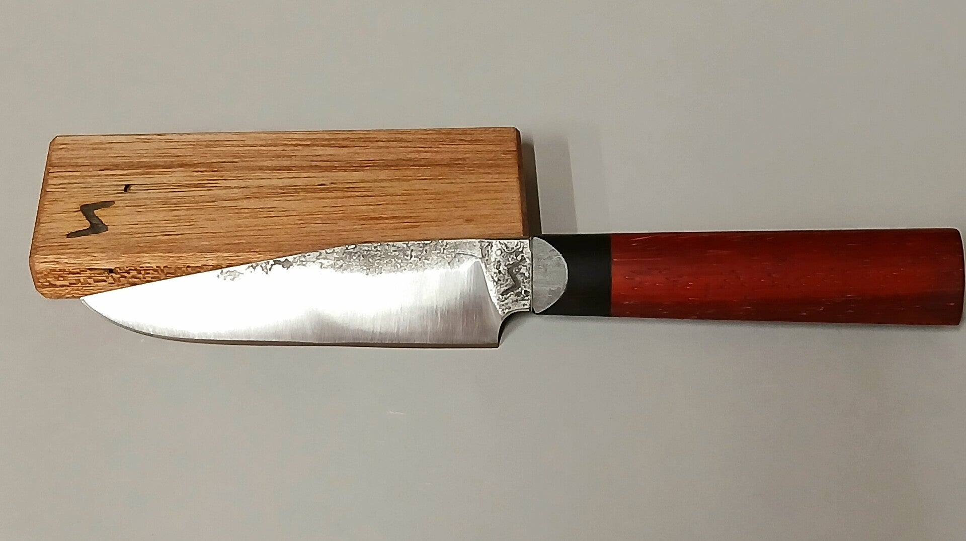 Een stijlvol pareermes van koolstofstaal, voorzien van een elegant handvat van ebbenhout en padouk. Wordt geleverd met een bijpassende houten schede.