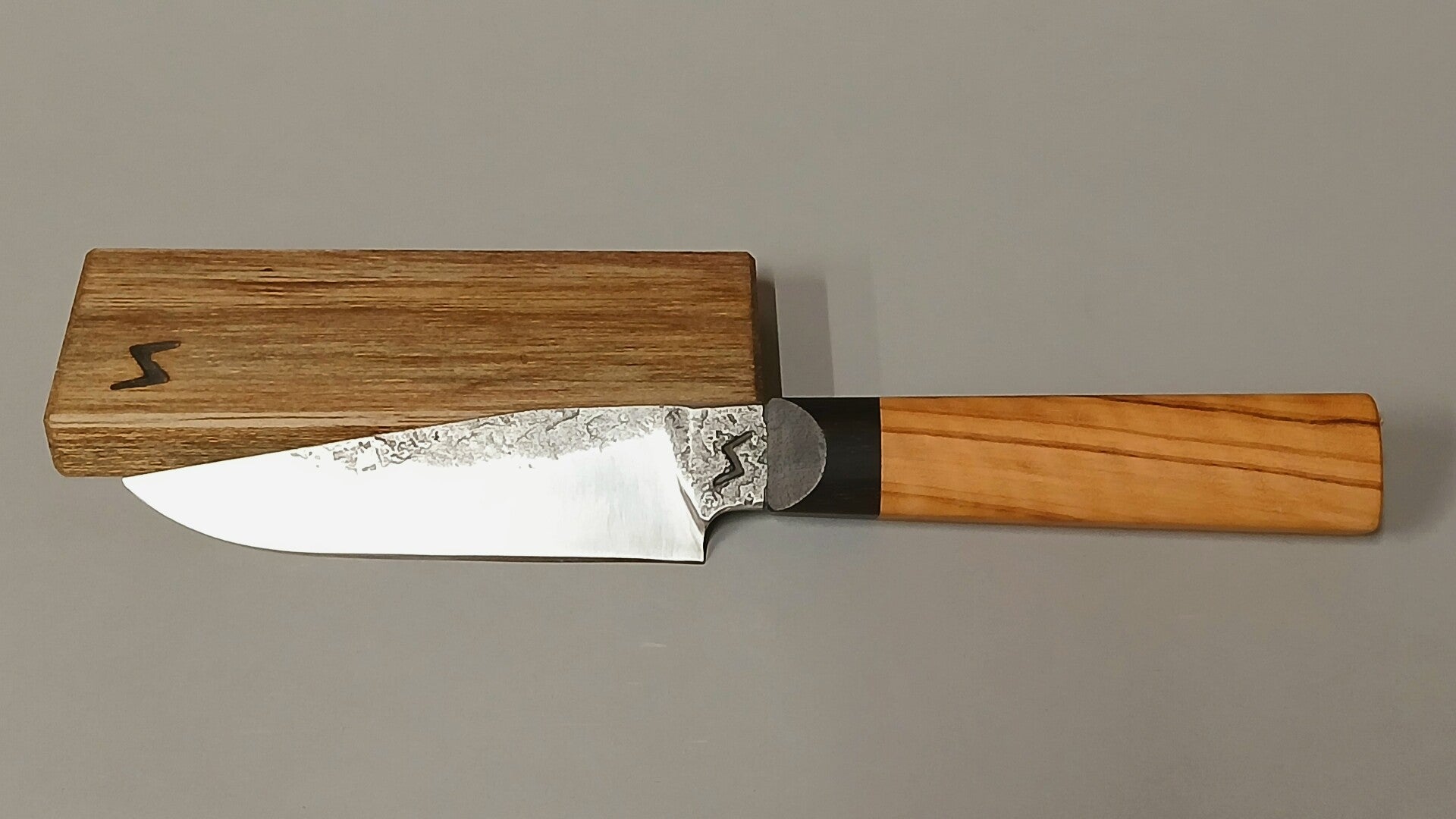 Een pareermes van hoogwaardig koolstofstaal, voorzien van een elegant handvat gemaakt van ebbenhout en olijfhout. Het mes wordt geleverd met een stijlvolle houten schede.